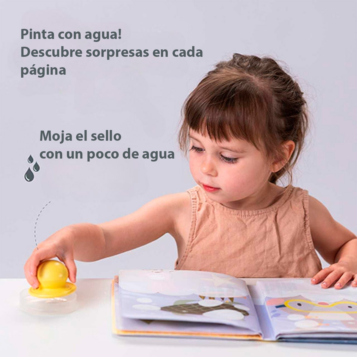 Lo más increíble es su efecto mágico: incluye un sello especial adaptado a manos pequeñas, que revela colores ocultos cuando se aplica agua sobre zonas blancas del libro.