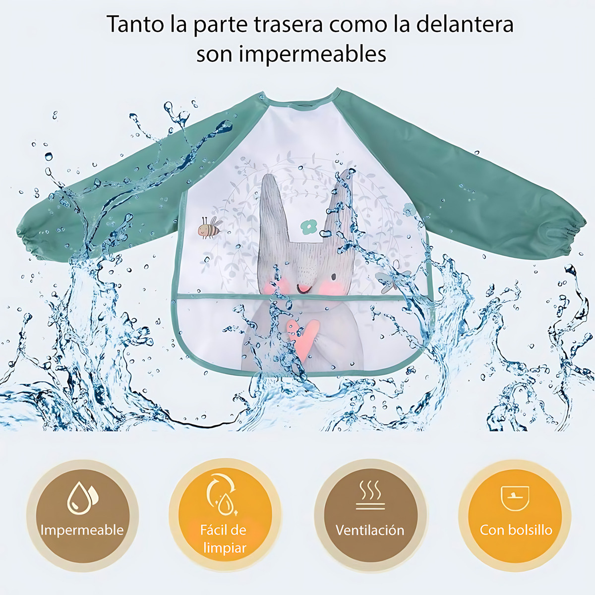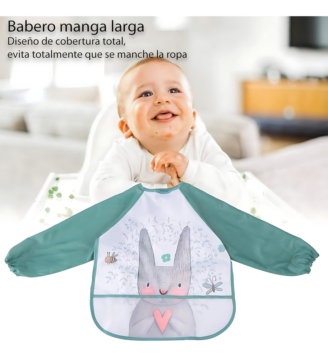 ¡Descubre el babero delantal con mangas que transformará la hora de la comida de tu bebé! Diseñado especialmente para peques de 6 a 24 meses, este babero es la solución perfecta para mantener su ropa limpia y ordenada.