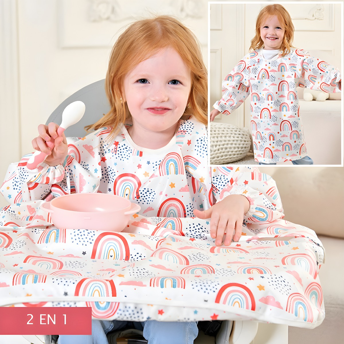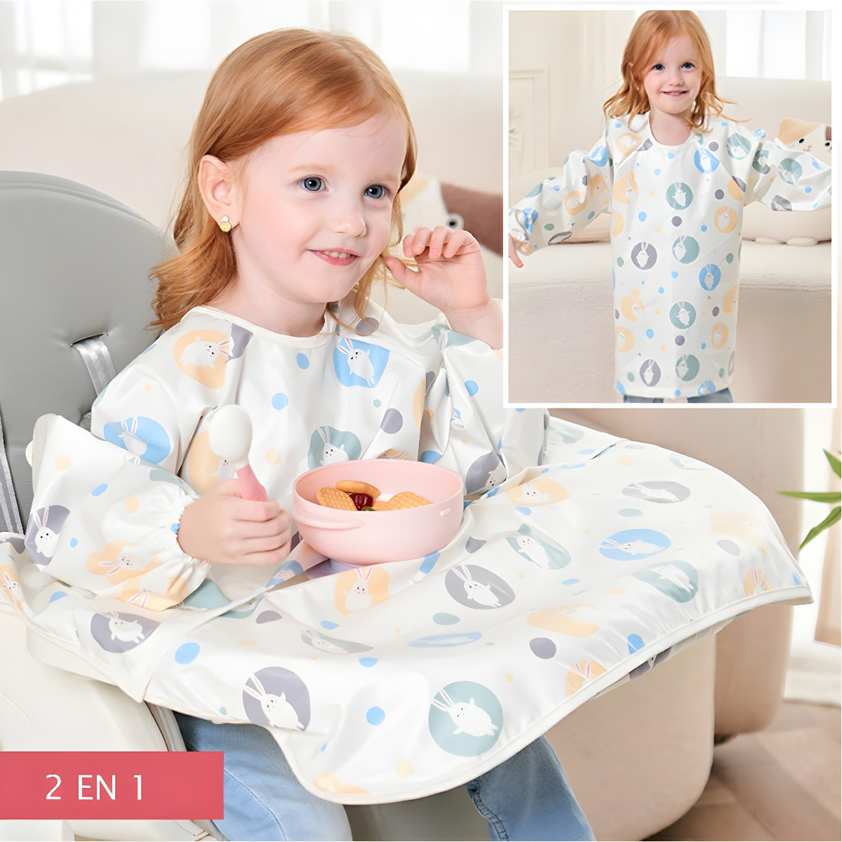 Las mangas largas y el delantal cubre mesa ofrecen una protección completa, manteniendo la ropa de tu bebé y los alrededores limpios.