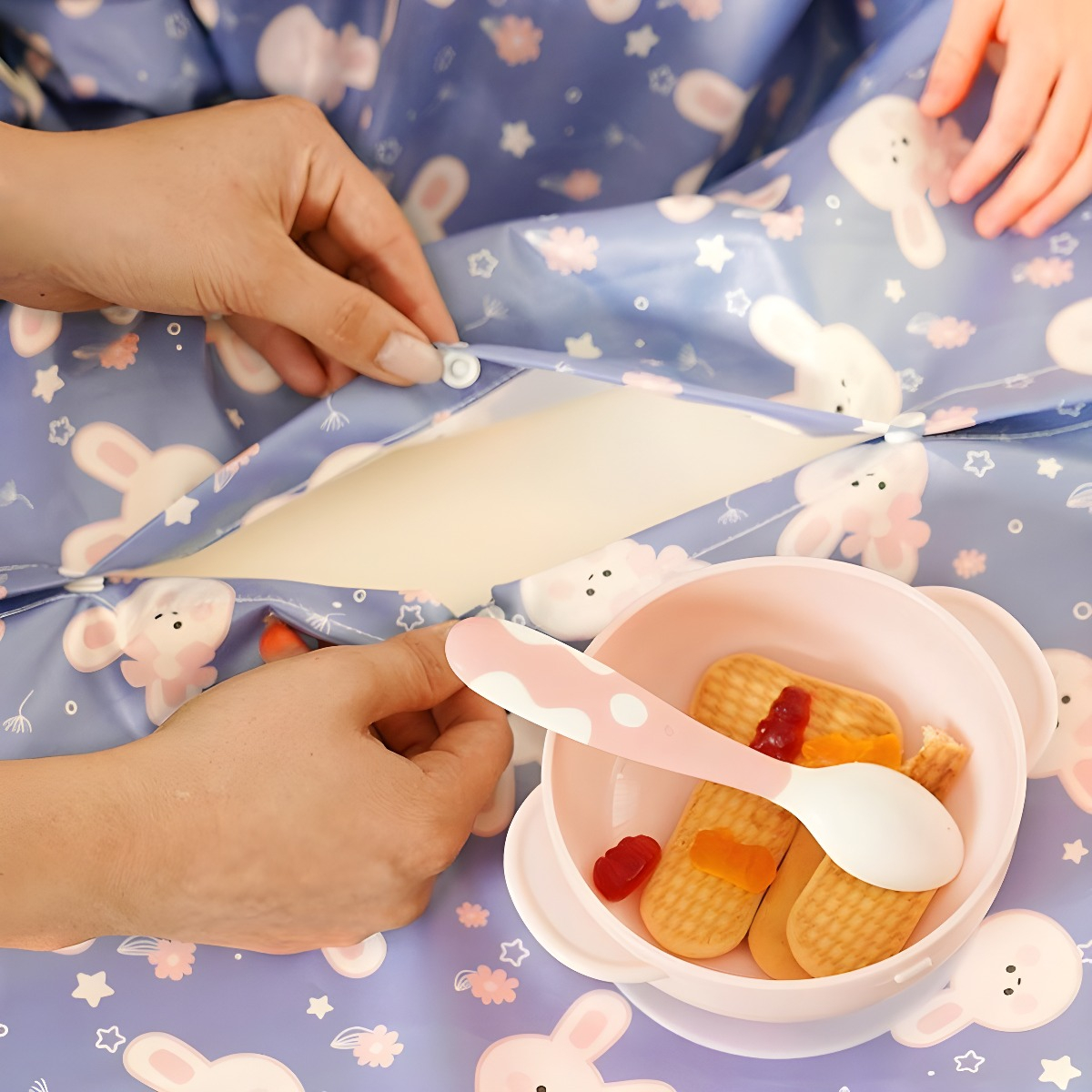 Diseñado para adaptarse a cualquier silla alta, el babero se ajusta perfectamente para asegurar a tu bebé, permitiéndole moverse libremente sin preocuparte por manchas indeseadas.