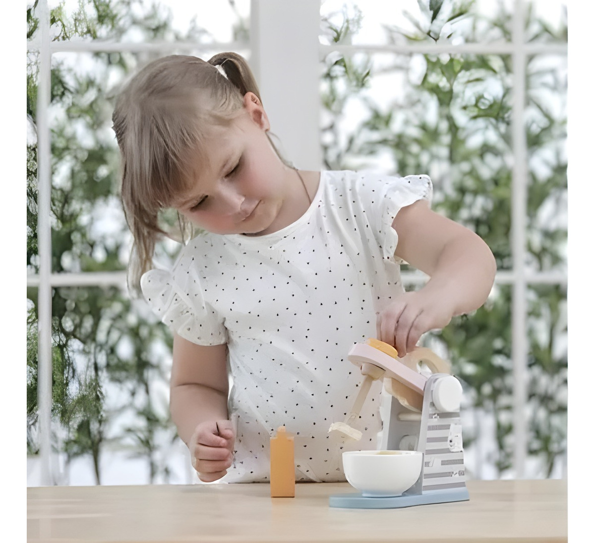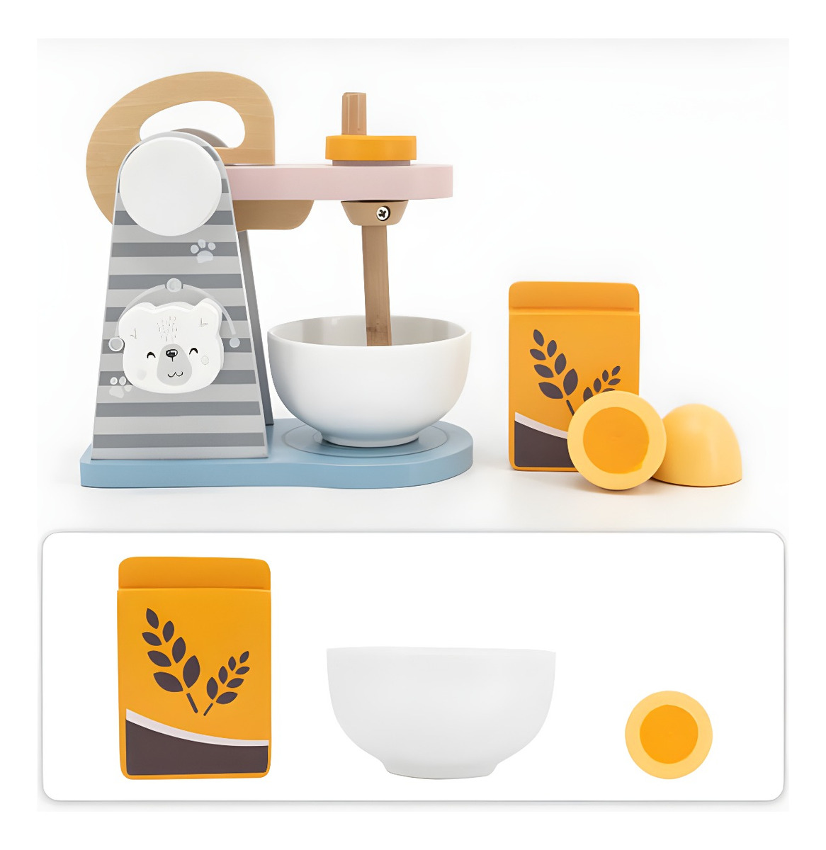 Este juego del joven chef incluye una encantadora batidora de madera, un cuenco y productos de juguete: un paquete de harina y un huevo de madera. ¡Deleita a familiares y amigos con creaciones culinarias imaginarias!