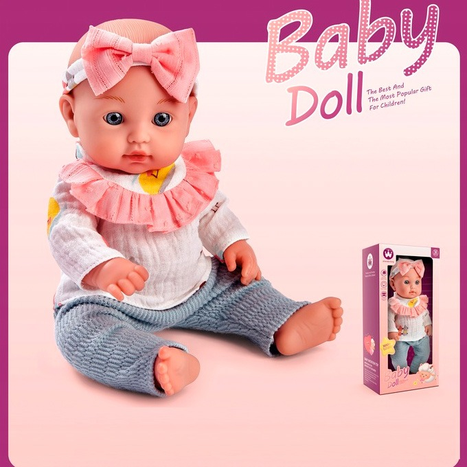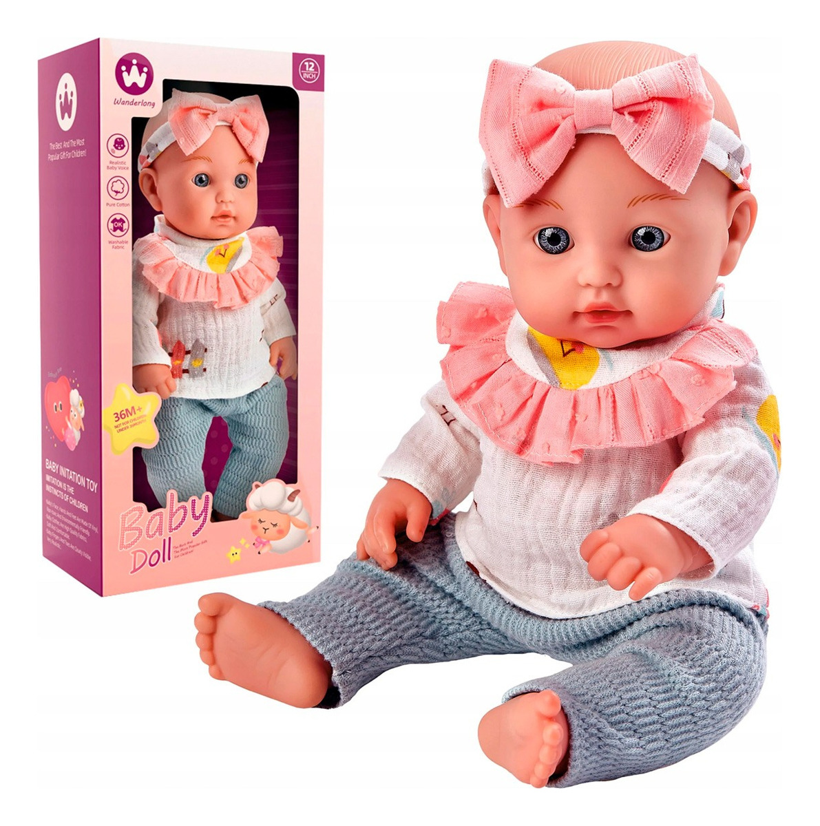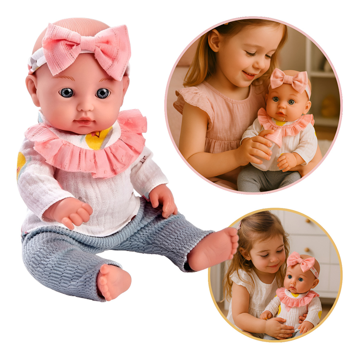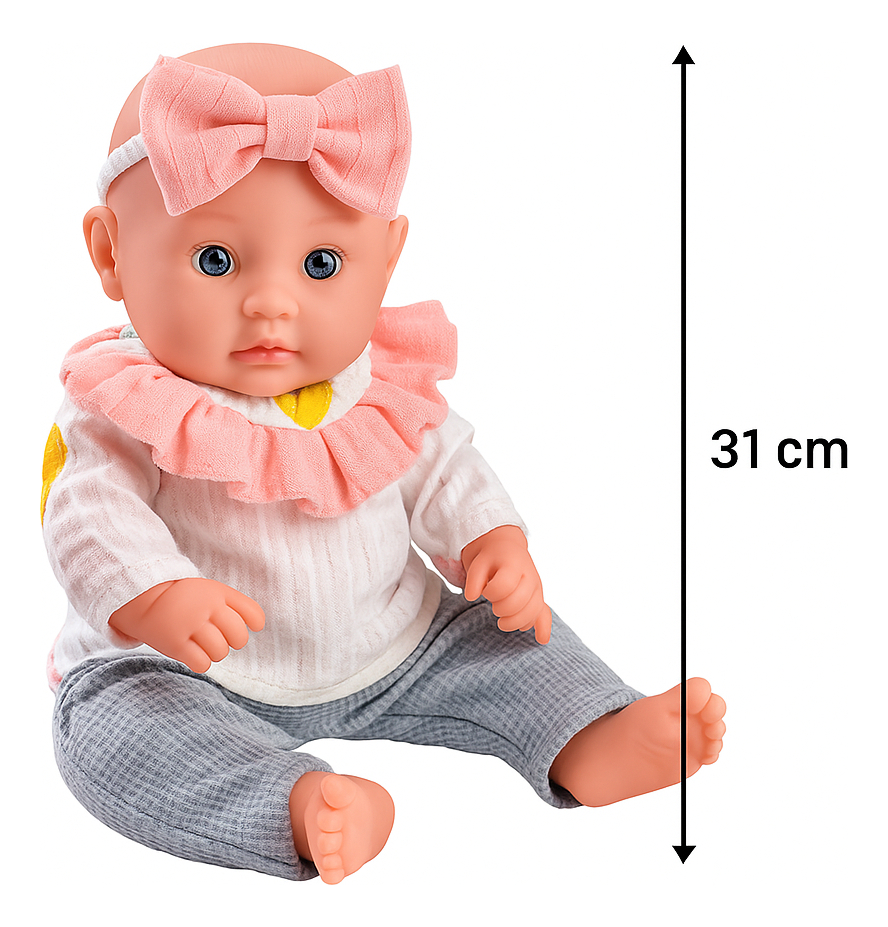 Con una expresión adorable, ojos expresivos y detalles cuidadosamente trabajados como sus dedos, este muñeco brinda una experiencia de juego auténtica. Viene vestido con una blusa blanca con cuello rosa, pantalón tejido gris y una hermosa vincha con lazo rosa que completa su look con delicadeza.
