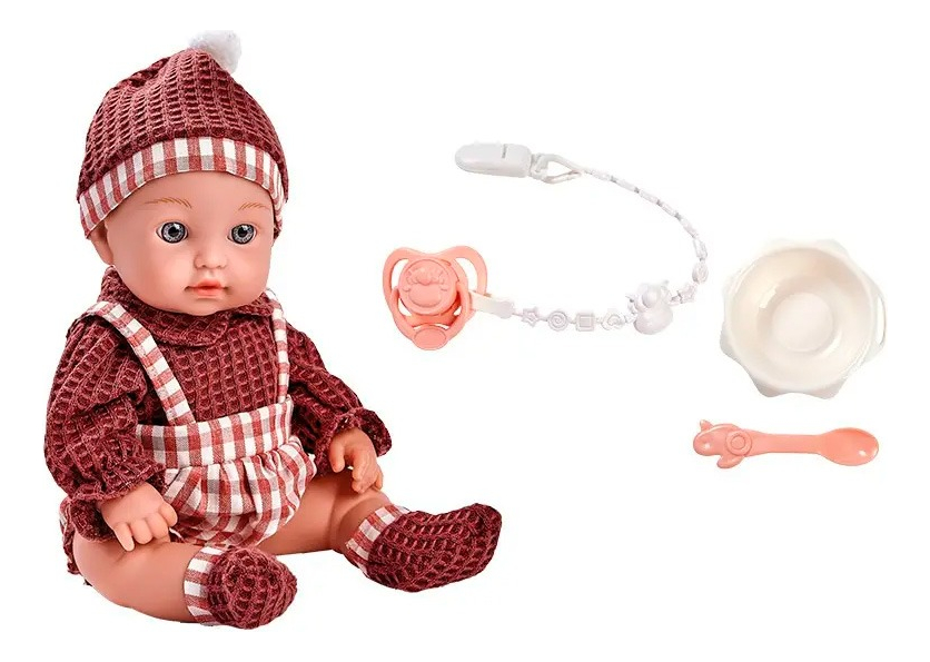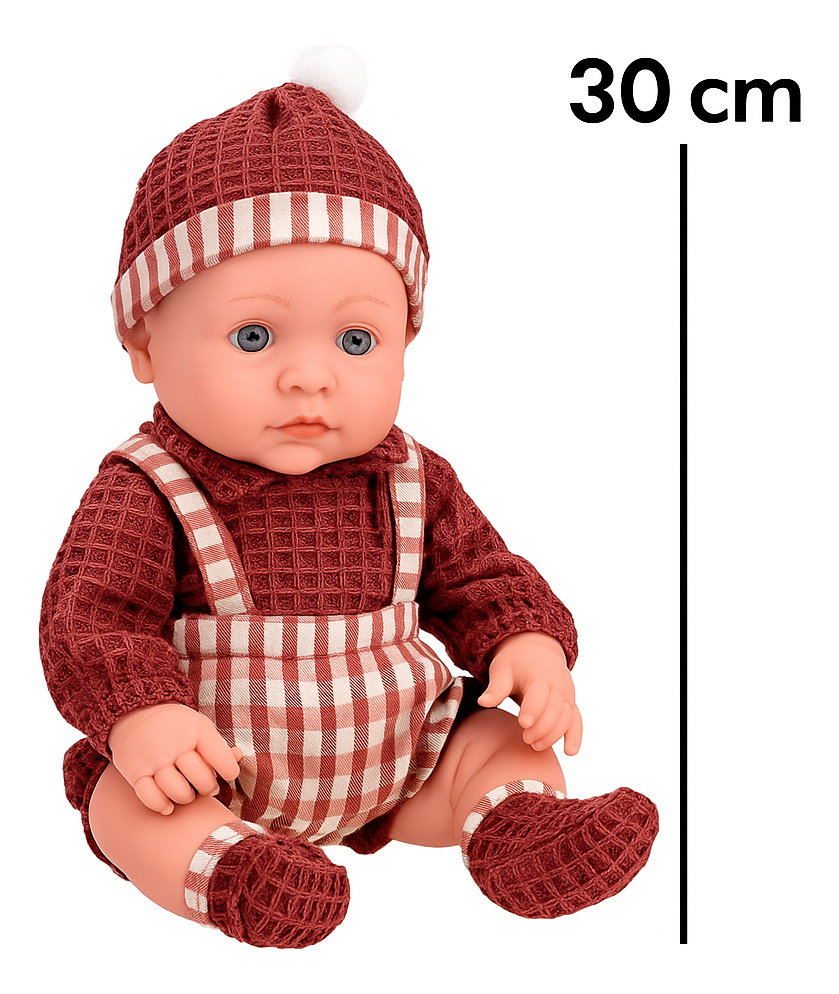 Cada detalle está cuidadosamente diseñado: su blusa marrón oscuro, el enterito a cuadros y los escarpines hacen juego con su gorro tejido. Todo está pensado para simular a un bebé recién nacido real, perfecto para el juego de roles, el cuidado emocional y el desarrollo afectivo.
