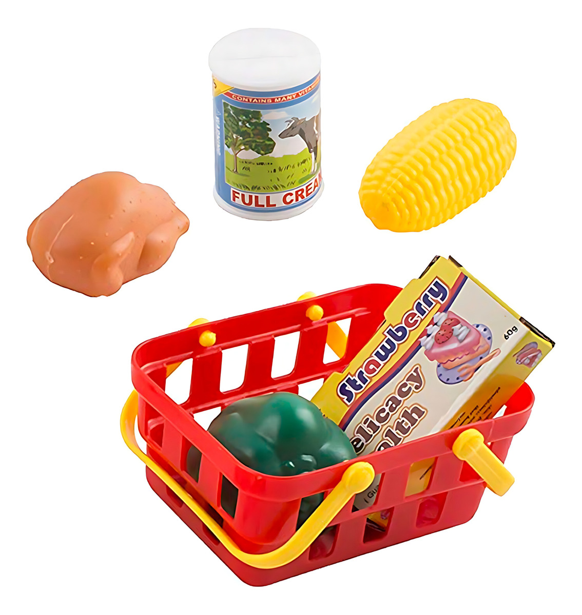 Cesta de compras con productos de juguete.