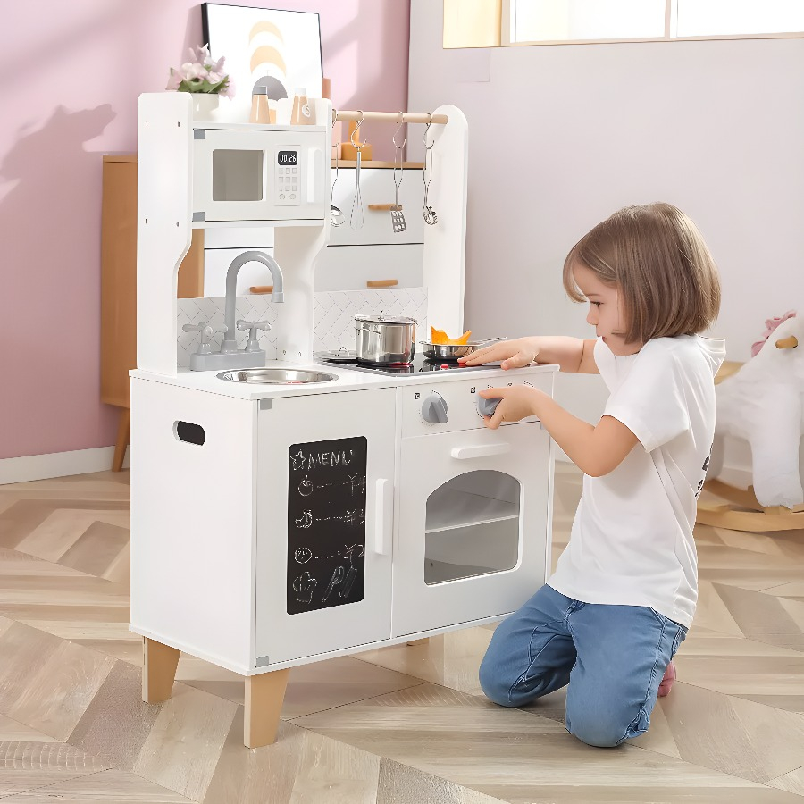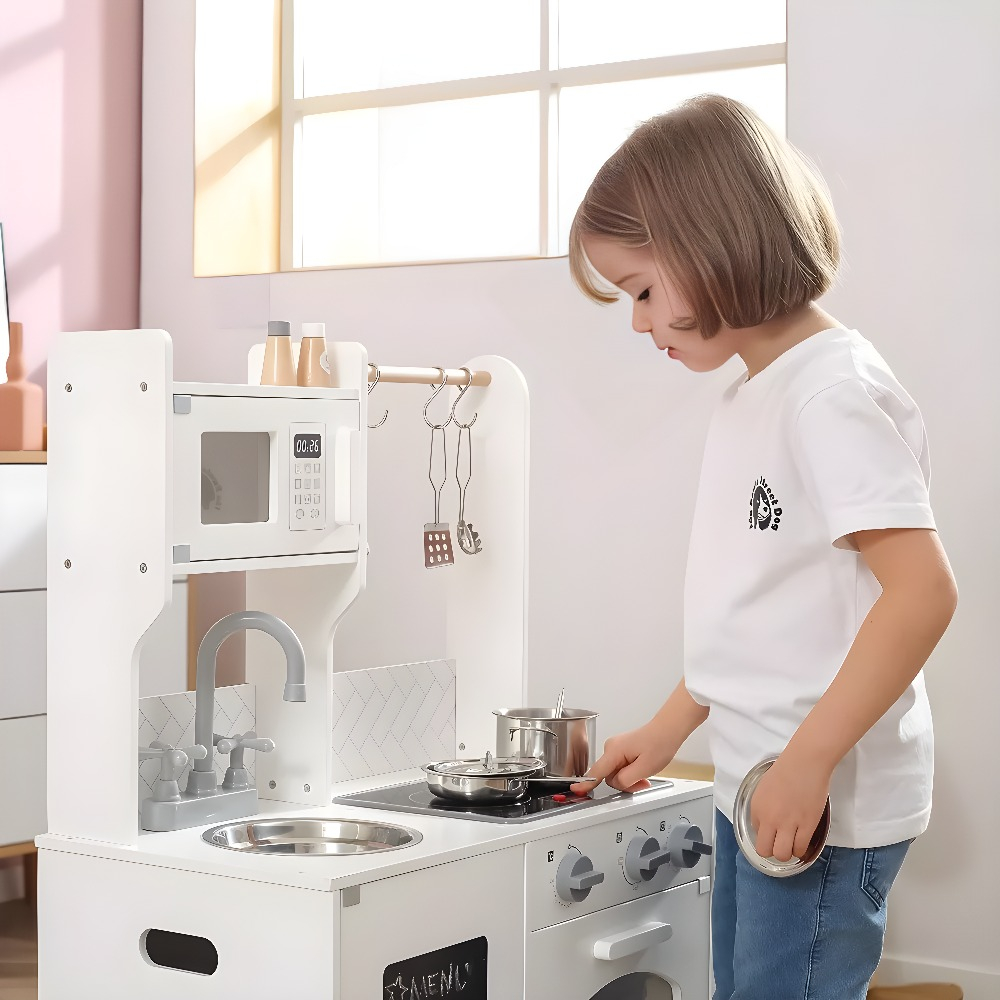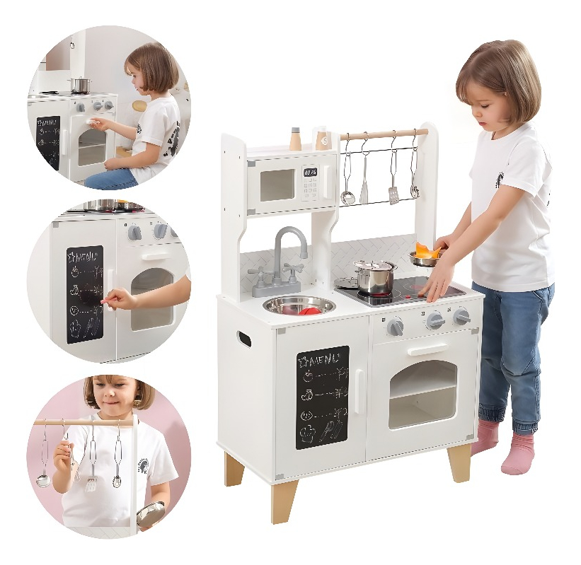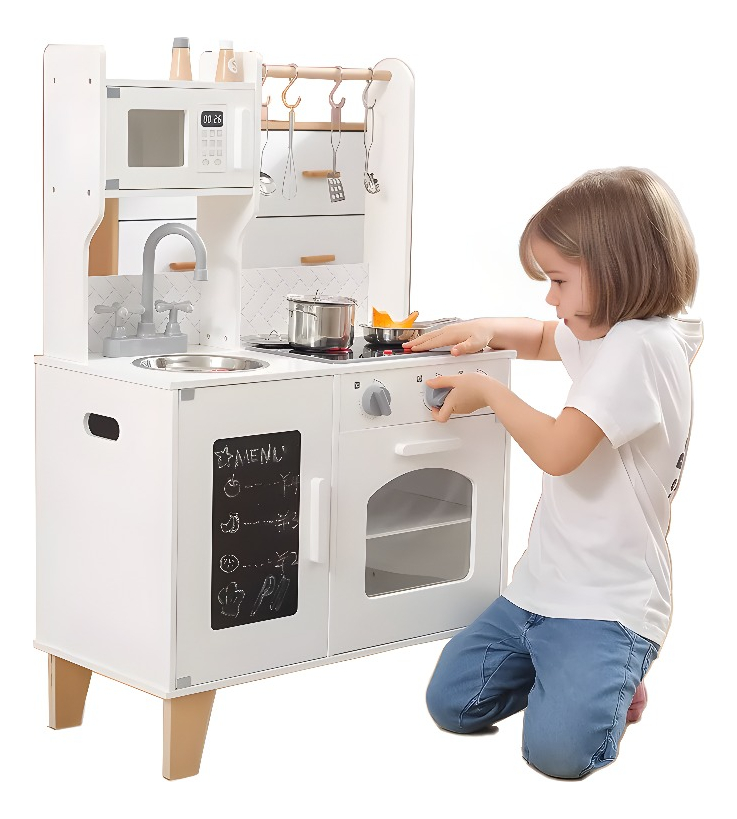¡Haz que cocinar sea un juego fascinante para los pequeños! Equipada con fregadero, horno, estufa, microondas y nevera, esta cocina incluye todos los detalles para una experiencia realista. Con accesorios como ollas, sartenes, utensilios y hasta verduras, los niños aprenderán mientras se divierten, estimulando su pensamiento creativo y desarrollando habilidades sociales.