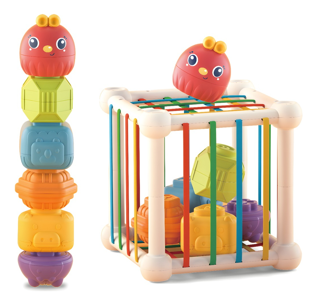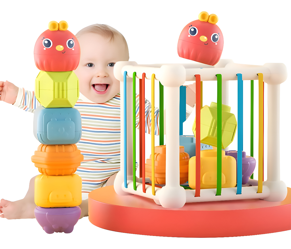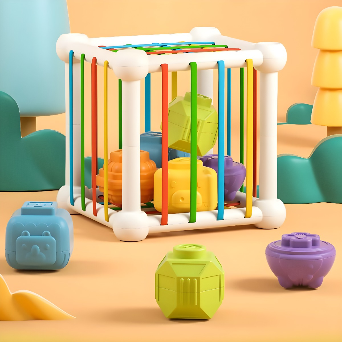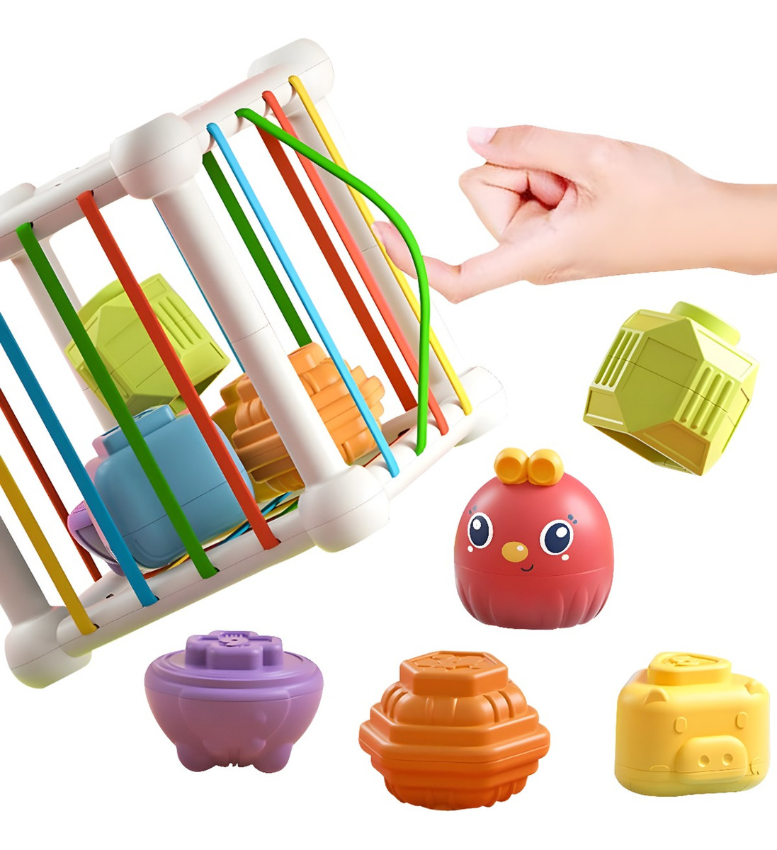Explora el aprendizaje a través del juego auténtico con nuestro Cubo Encastrable con Elásticos. Diseñado para edades de 10 meses en adelante, este juguete clasificador de formas ofrece una experiencia de desarrollo integral para bebés y niños pequeños.