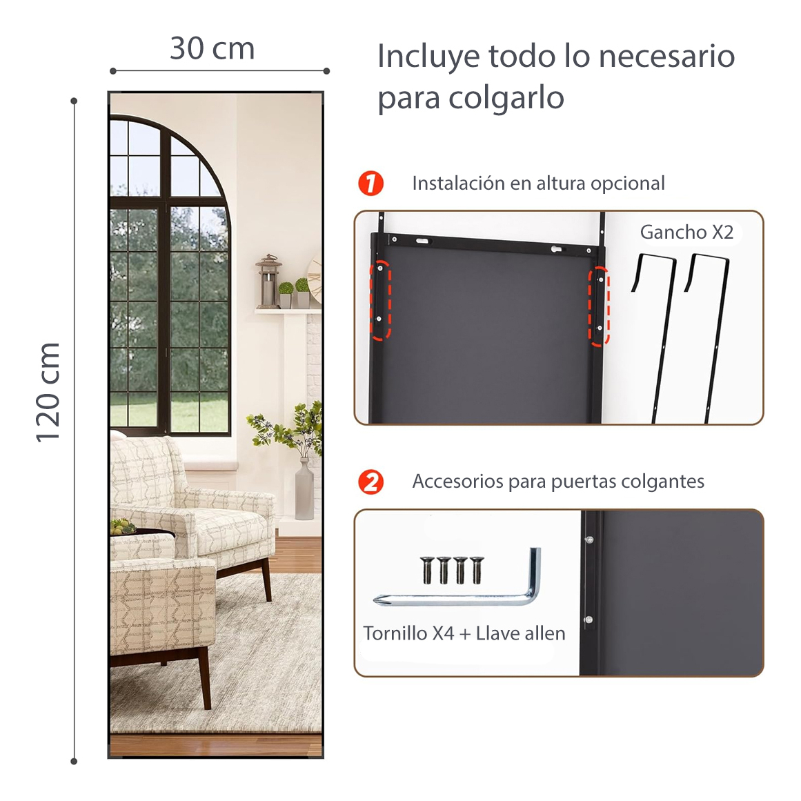 Incluye ganchos ajustables para colgar en puertas con tres opciones de altura, así como accesorios para montar en la pared, tanto en posición horizontal como vertical. Su película a prueba de explosiones en la parte posterior lo hace seguro para tu familia, evitando que el vidrio roto cause accidentes.