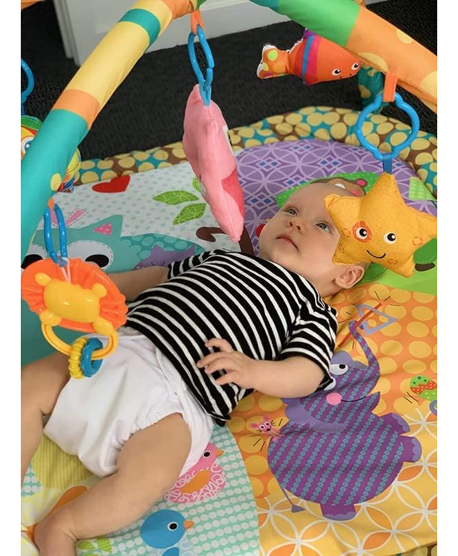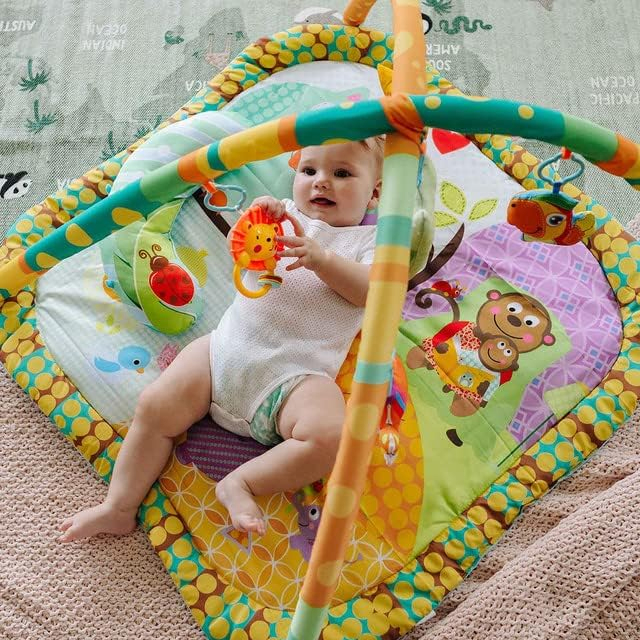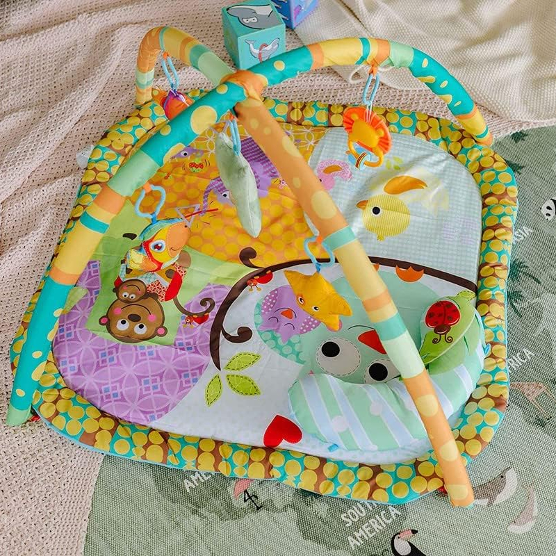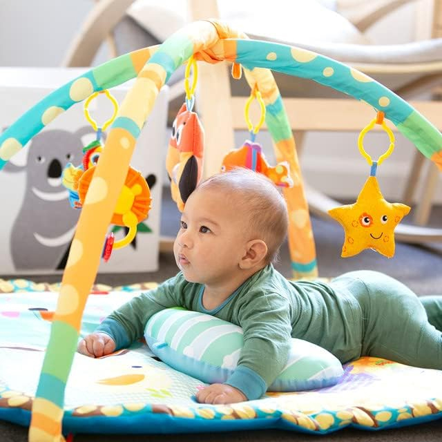 El arco ajustable en altura permite adaptarse al crecimiento de tu bebé, mientras que los sonajeros y juguetes colgantes promueven la coordinación mano-ojo y la exploración táctil. Incluye un cojín de apoyo que facilita el tiempo boca abajo, ayudando a fortalecer los músculos esenciales para el desarrollo motor. Fabricado con materiales no tóxicos, es seguro y duradero.