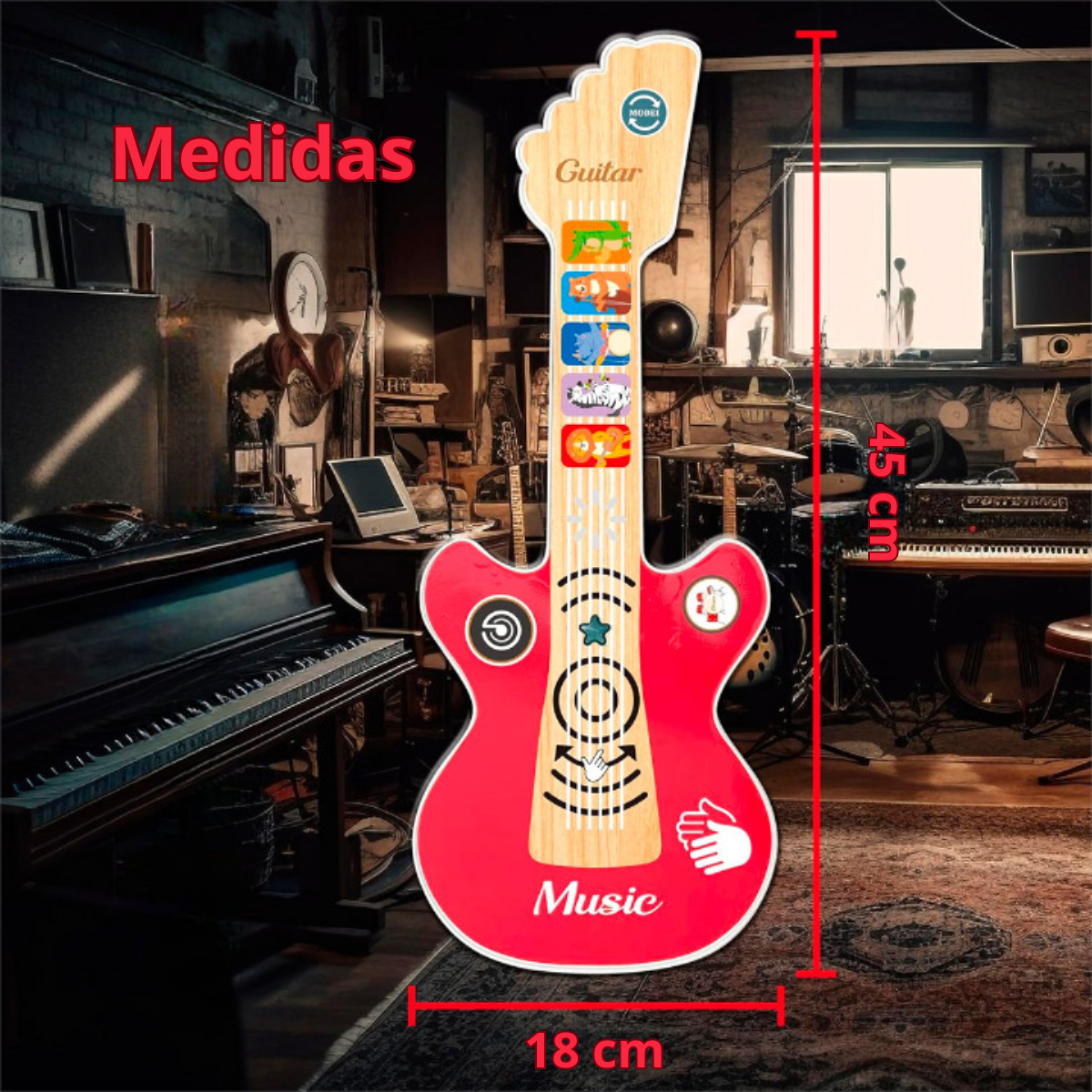 Con un diseño colorido, medidas ideales para manos pequeñas (45 x 18 x 2,5 cm) y funciones interactivas, esta guitarra está equipada con 11 canciones infantiles, efectos de batería y aplausos, y tecnología sensible al tacto que convierte cada juego en una experiencia musical única.