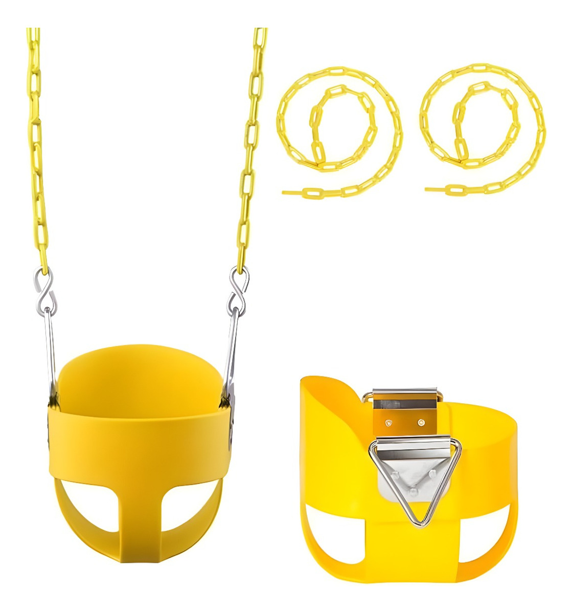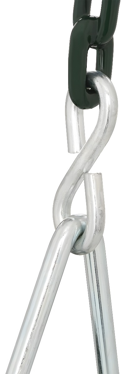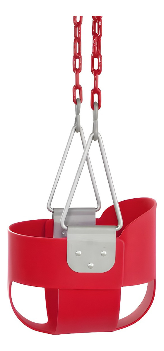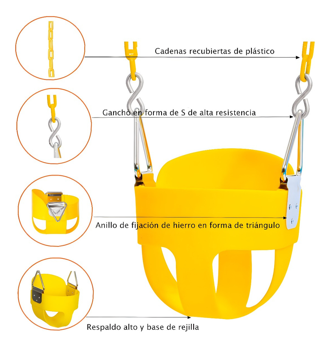 Cadenas envueltas en plástico para evitar pellizcos y diseño con respaldo alto para prevenir giros hacia atrás.