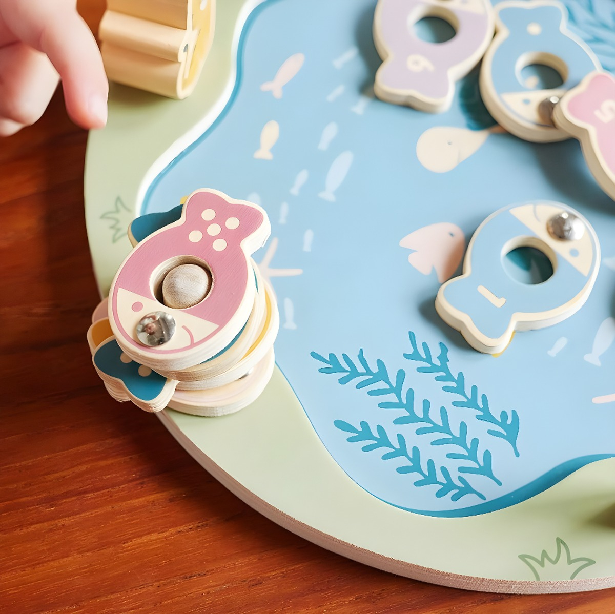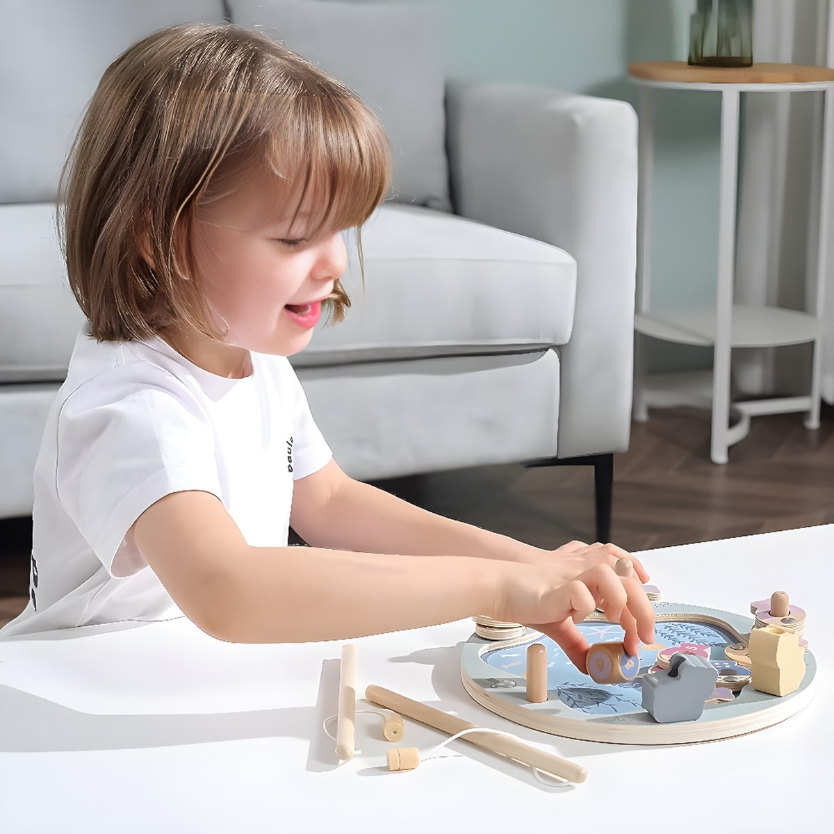 Descubre el completo set que incluye una base de juego, 2 cañas de pescar, un cubo y 12 peces magnéticos. Cada pez tiene detalles en el reverso, ya sea colores, números o puntos, permitiendo diversas actividades educativas y competitivas para los pequeños.