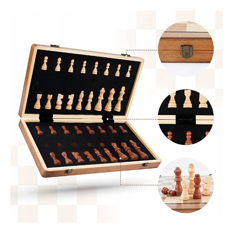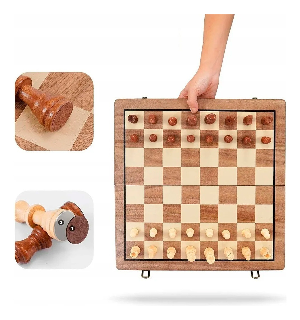 Incluye tablero plegable de 29×29 cm con diseño artesanal y piezas imantadas.