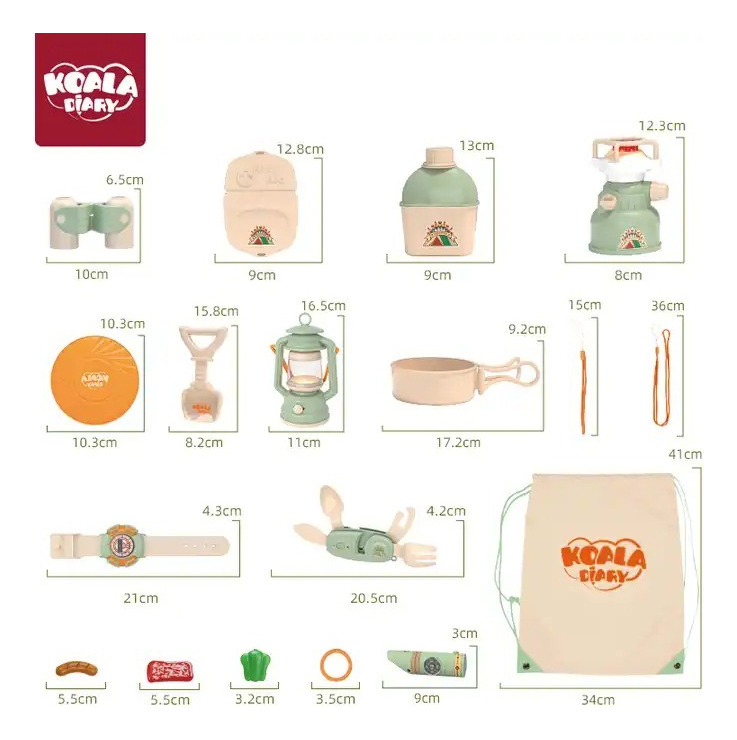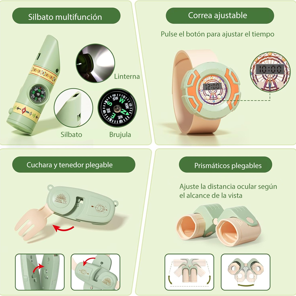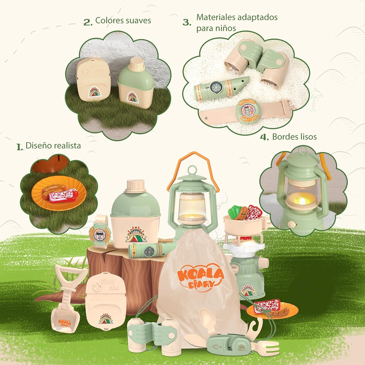 Este completo kit incluye todo lo necesario para un día de aventura: lámpara de aceite, estufa con efecto de llama, juguetes de alimentos, binoculares, reloj, pala, y mucho más. La lámpara de aceite y la estufa se iluminan, brindando una experiencia auténtica que fascinará a los niños, mientras que los binoculares y la brújula les permiten explorar como verdaderos aventureros.