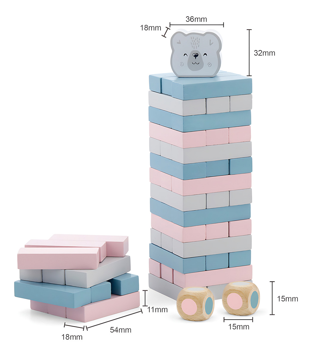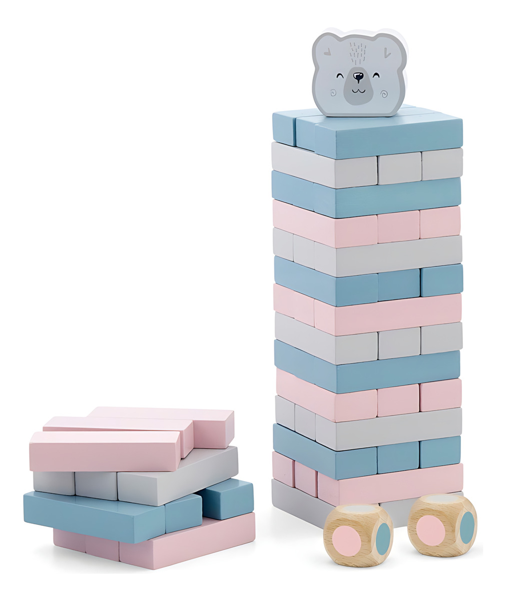 Este clásico juego de apilamiento incluye 56 bloques de madera y 2 dados, lo que permite agregar emoción extra tirando los dados para decidir qué pieza sacar.