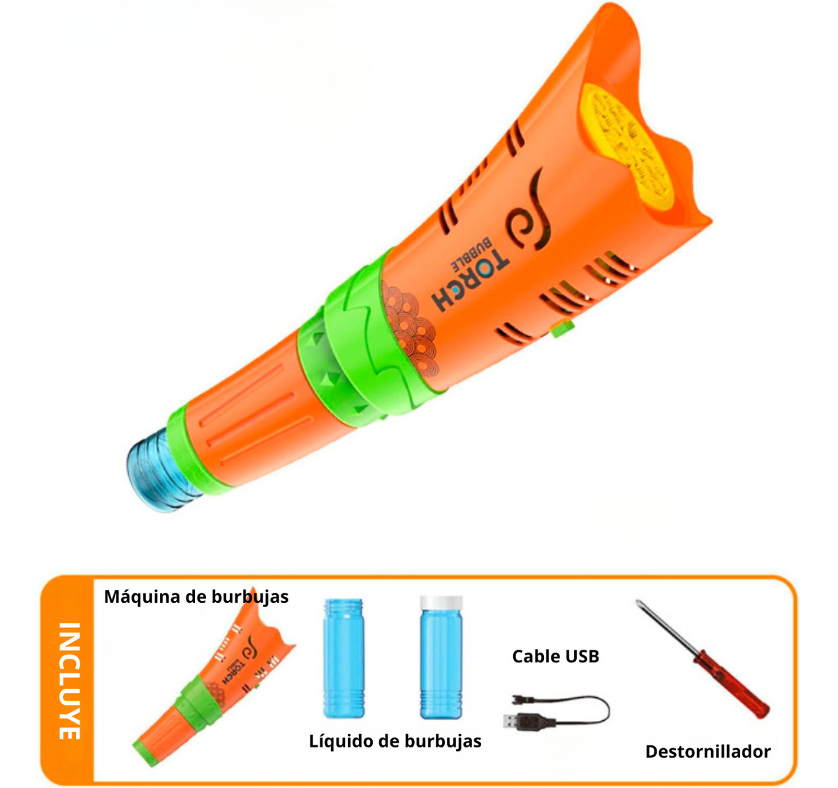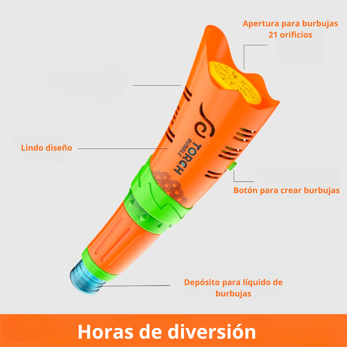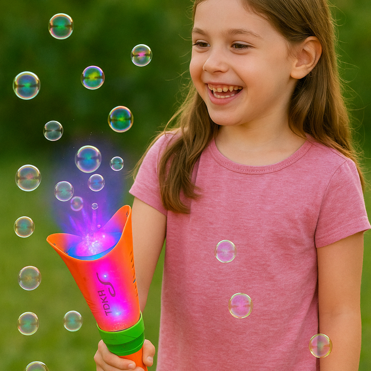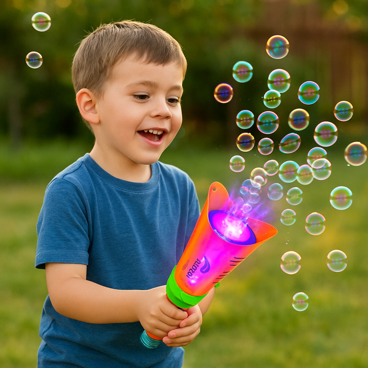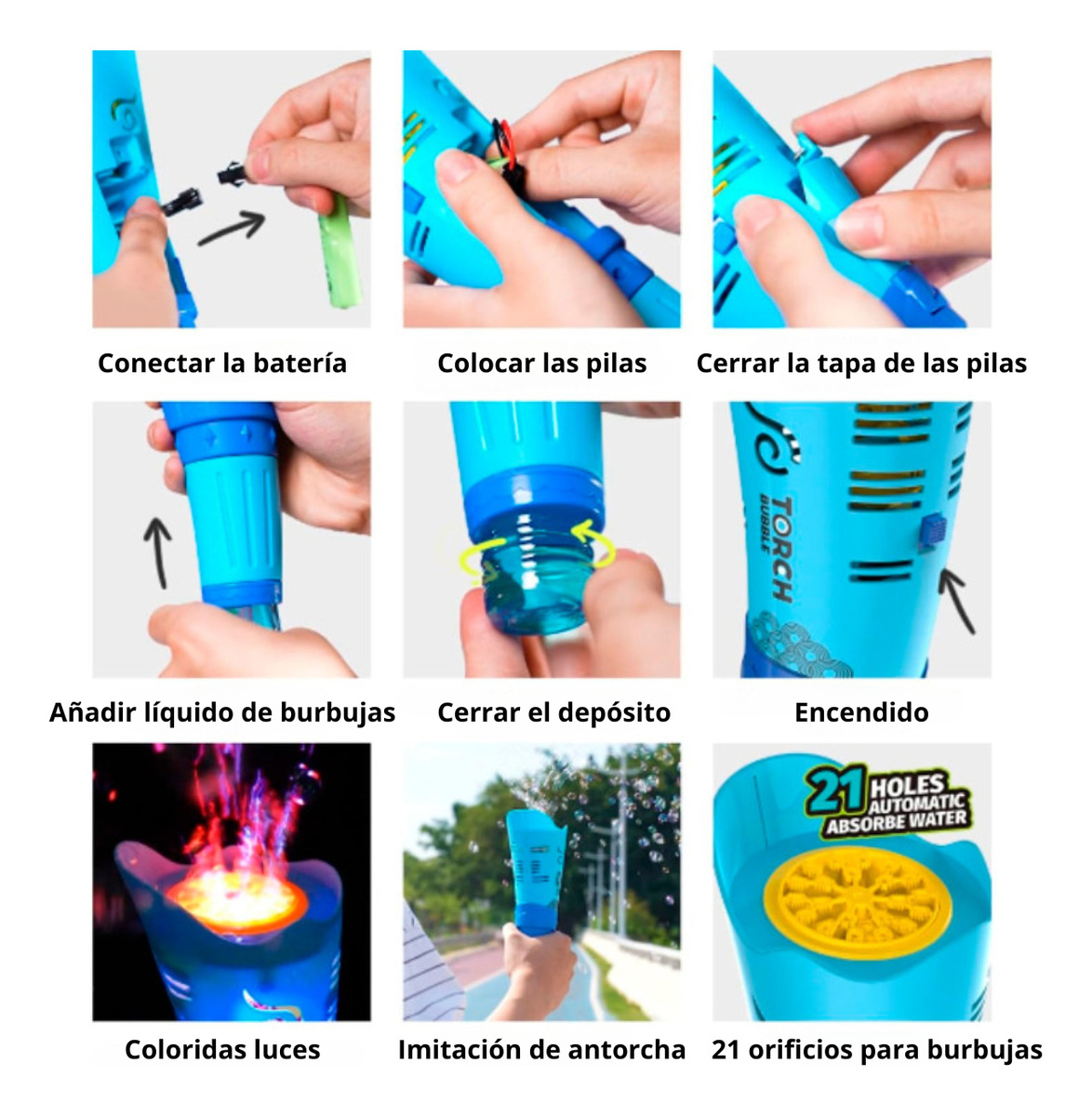 Con 21 agujeros emisores de burbujas y un sistema de luces LED integradas, esta máquina crea una lluvia continua de burbujas que deslumbra a niños y niñas. Su diseño moderno, compacto y resistente la convierte en el centro de atención en cumpleaños, juegos al aire libre o actividades en casa.