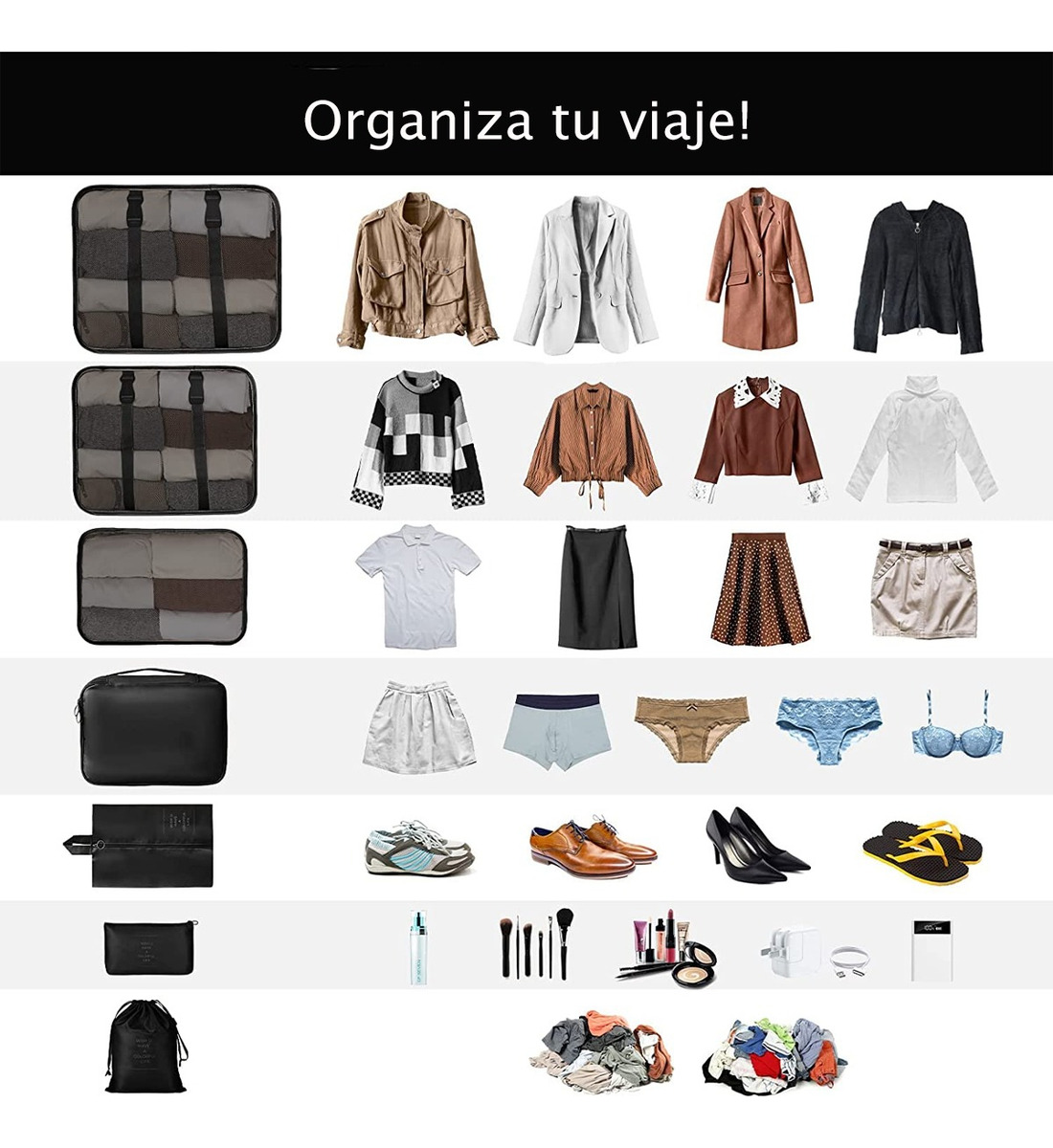 Ahorra tiempo y espacio con nuestros organizadores. Encuentra rápidamente lo que necesitas y aprovecha al máximo el espacio en tu valija. Los cubos de embalaje son ligeros, fáciles de plegar y no añaden peso extra a tu equipaje. Además, son sencillos de limpiar, lo que facilita su mantenimiento y asegura que siempre estén listos para tu próxima aventura.
