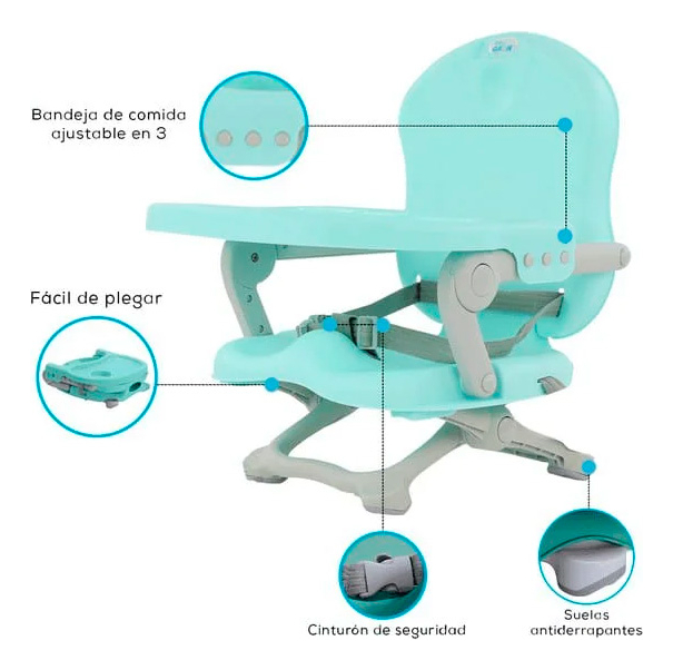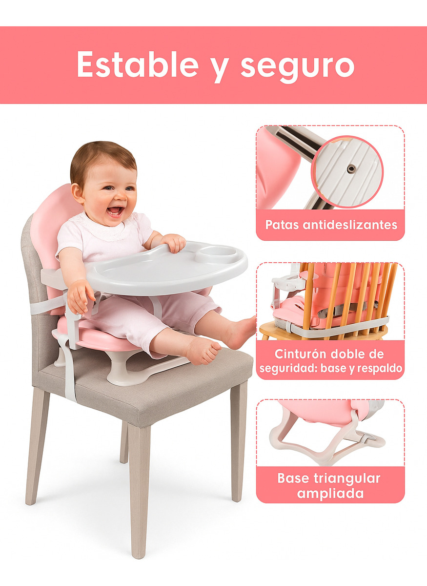 Equipada con un arnés de 3 puntos que mantiene a tu niño firmemente en su sitio y dos correas adicionales en la parte inferior y el respaldo del asiento, esta silla garantiza la seguridad de tu pequeño durante las comidas. La base de goma antideslizante asegura que el asiento permanezca estable en la silla del comedor, brindando tranquilidad tanto a padres como a hijos.