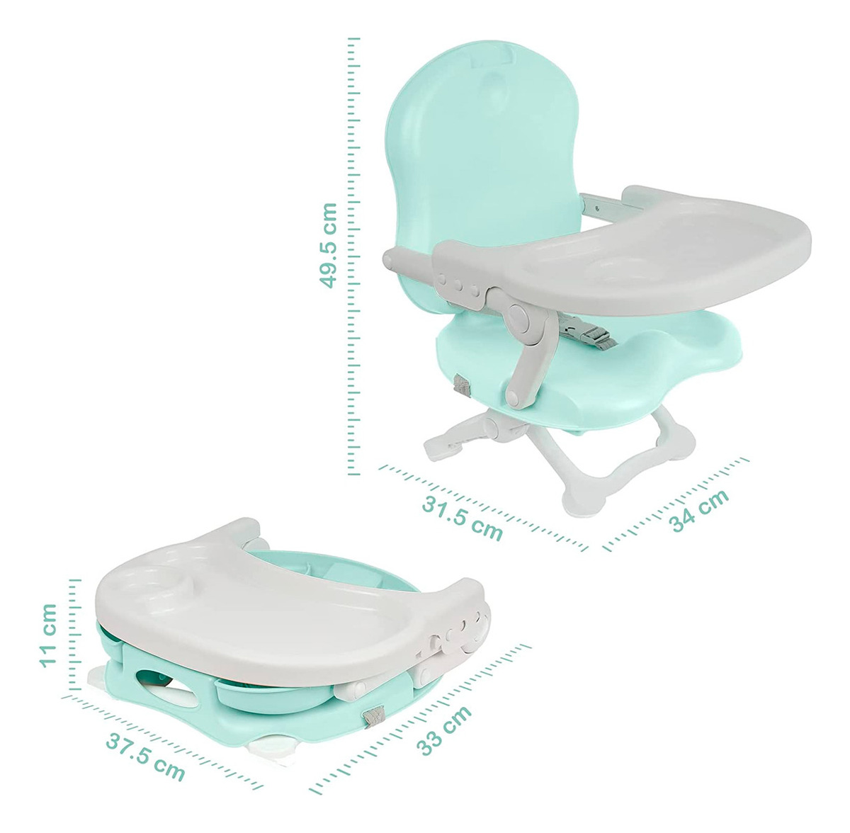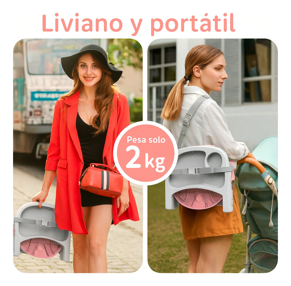 Con un peso de solo 2 kg y unas dimensiones de 35 cm x 34 cm x 50 cm cuando está desplegada, esta silla elevadora es la elección ideal para familias en movimiento. ¡Llévala contigo donde sea que vayas!
