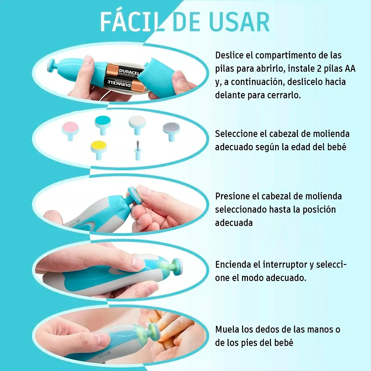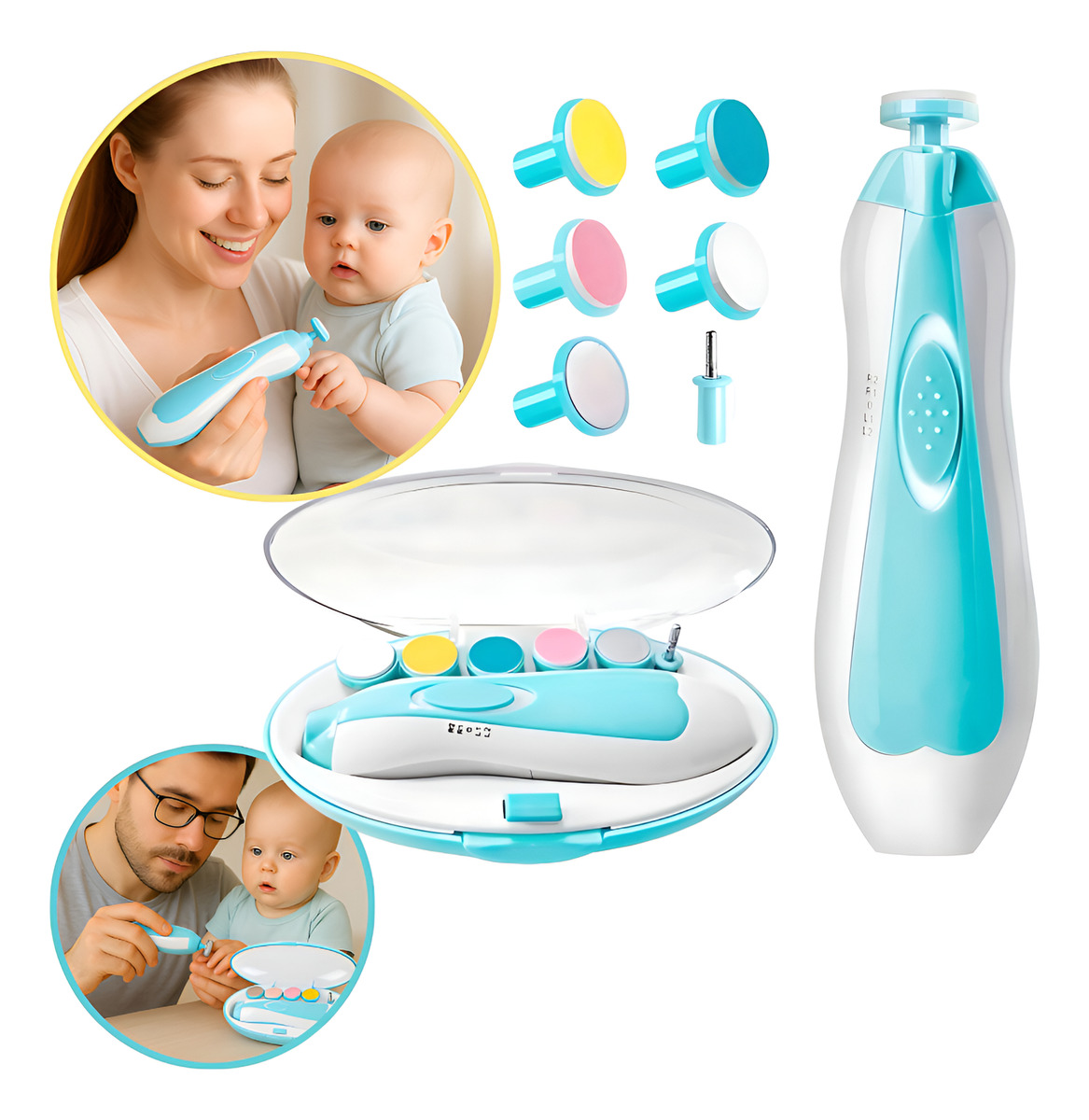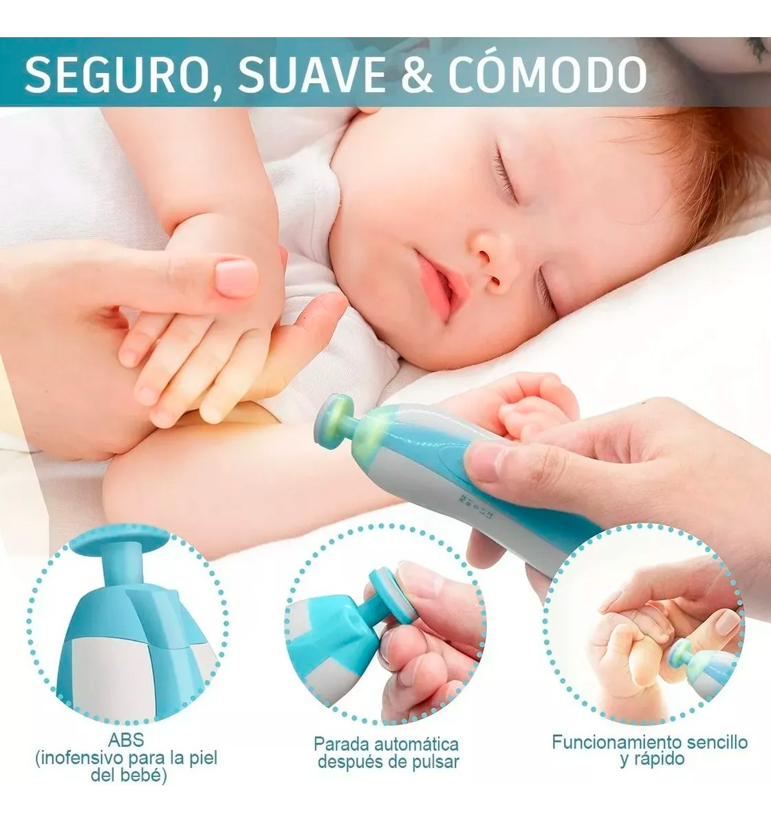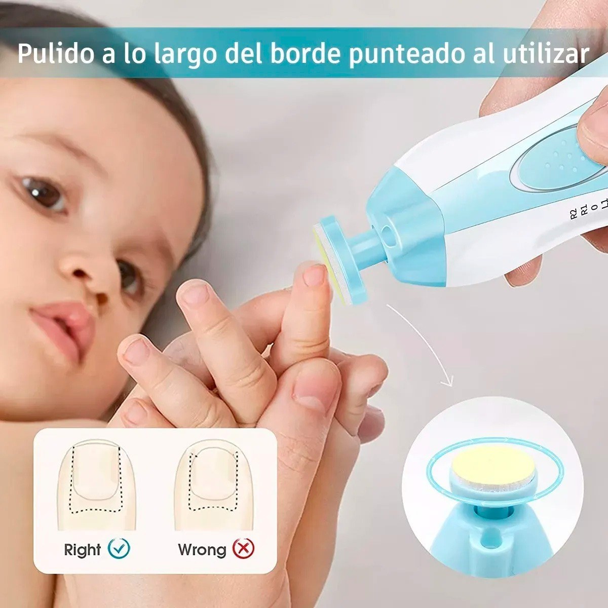 Diseñado especialmente para bebés desde los primeros meses y también útil para adultos, este torno eléctrico recorta y pule suavemente sin dañar la piel ni las cutículas. Su sistema de pulido 360° de velocidad constante deja las uñas lisas, suaves y sin bordes filosos.